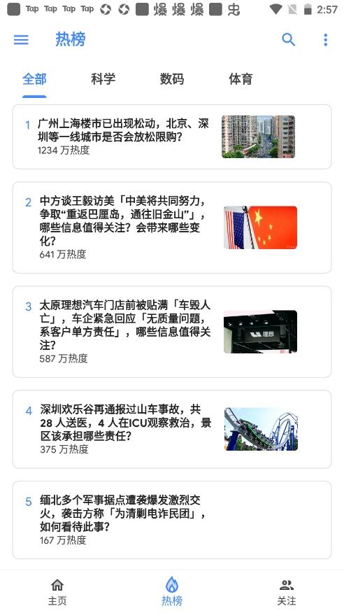 4、点击下方功能栏中的【热榜】,就会出现很多的榜单,比如说科学、数码、体育等;