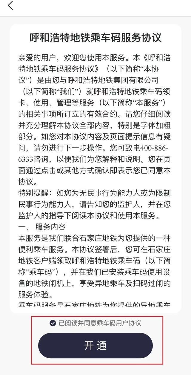 在认真阅读协议后,勾选上页面下方的“已阅读并同意乘车码用户协议”后,点击“开通”。