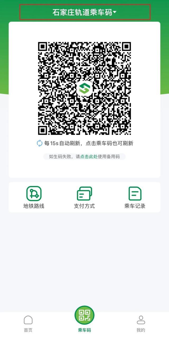 打开APP乘车码页面,并点击页面上方的“石家庄轨道乘车码”。