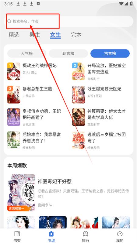 3、点击上方搜索框输入书名、作者可以快速找到想看的小说作品
