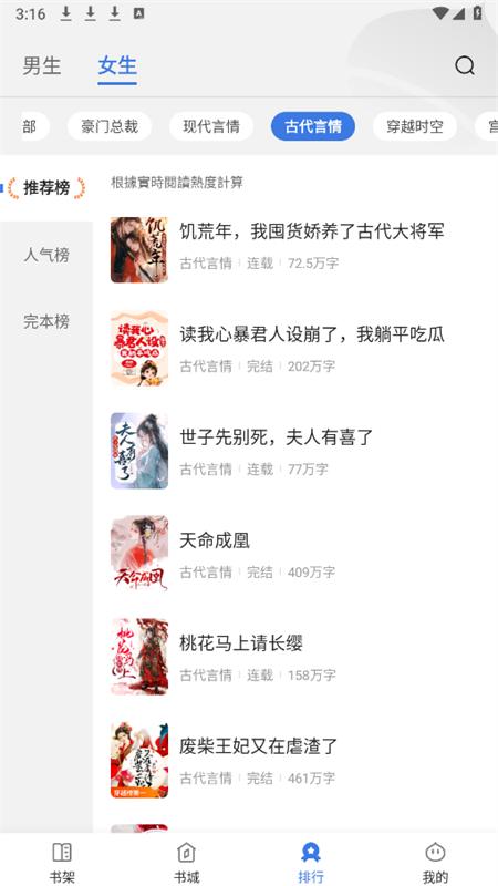4、在排行榜页面,可以实时看到最新的人气、完结等榜单排名