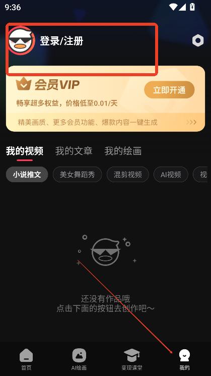 进入首页,点击我的,选择登录注册