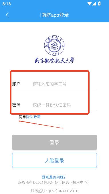 输入你的学工号密码,登录,勾选隐私协议,即可登录