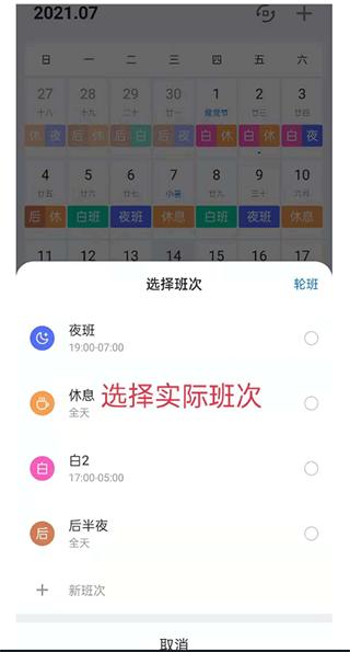3、设置当日班次,即今天是轮班周期中的哪个班次。注意这里可以选择其他日期。(左右滑动 日期即可改变当前日期) ;