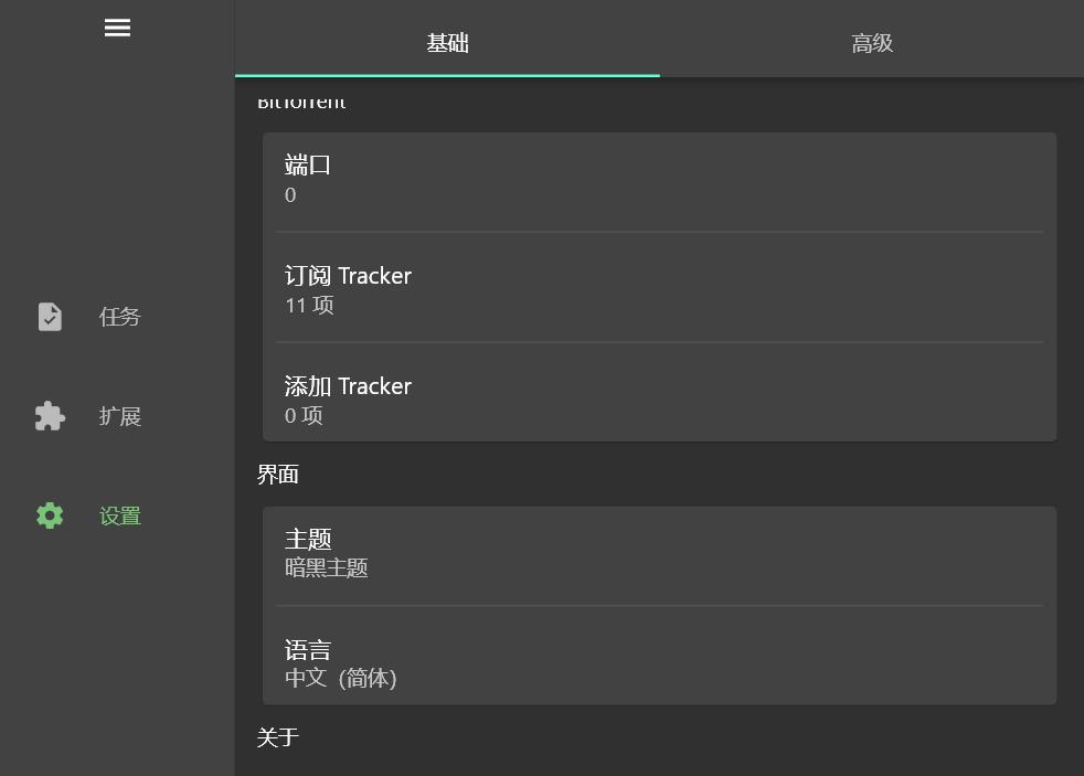 软件总体非常清爽,没有广告和需要登录什么的,在设置界面可以修改默认下载目录,同时下载的连接数以及用于Torrent下载的Tracker设置。