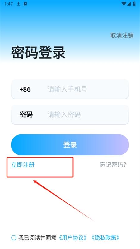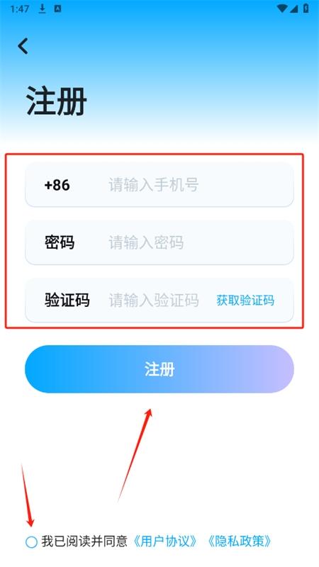 3、输入手机号和验证码,设置好密码,同意用户协议和隐私政策后点击注册即可