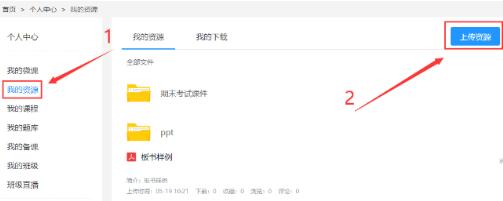2、进入“个人中心---我的资源”,点“上传资源”上传课件