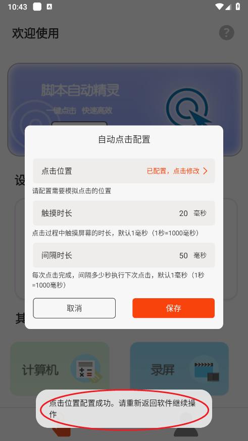 5、如图所示界面,对自动点击配置进行设置。例如点击位置,触摸时长,间隔时长等。