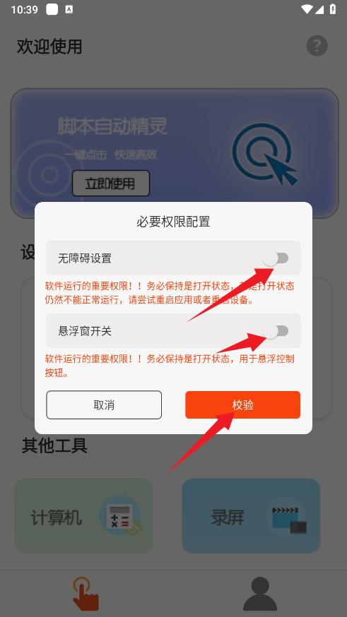 3、然后将必要的【无障碍设置】和【悬浮窗开关】的两个控制按钮开启。然后点击【校验】校验通过,表示开启成功。