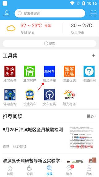 3、点击“发现”,有淮滨今日天气,和最新推荐资讯,如果需要顺风车服务,可以找到“顺风拼车”进入。