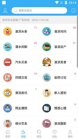 2、在“论坛”界面可以一键直达装修讨论、淮滨商讯、新人报到以及缘分交友等平台。