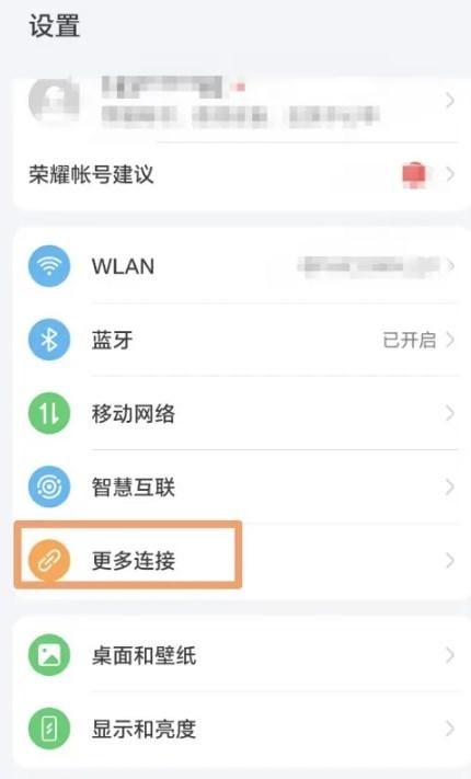 第一步:打开荣耀手机设置,在设置页面点击【更多连接】