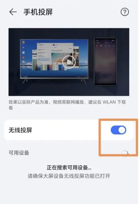 第三步:打开【无线投屏】后的蓝色开关即可搜索设备连接进行投屏