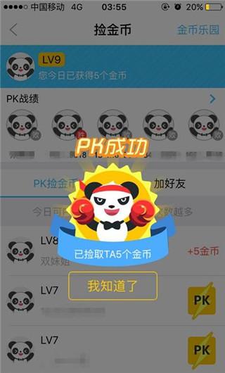 ③、好友PK得金币:点击界面“捡金币”进入与好友PK界面,选择好友PK(一般选择等级比自己低的)