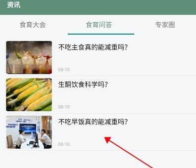 我们可以看到这里有很多的关于饮食的问题,比如早上不吃饭能不能减肥什么的,点击进入可以看专家解答