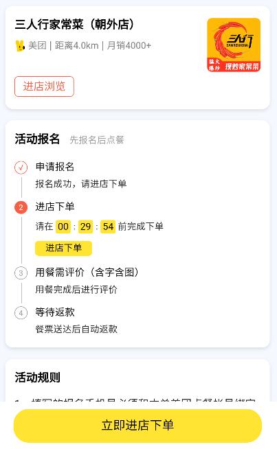 3、先抢名额后下订单。下单店铺必须与抢名额的店铺一致,且必须在报名当天下单,否则无法返现: