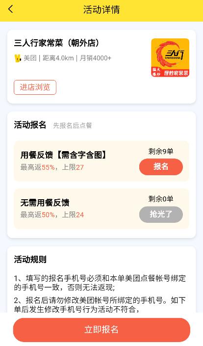 需在报名30分钟内下单支付,超时视为自动放弃活动;同一手机号一天最多报名5次,取消报名不减次数;同一手机号同一商家一天内最多报名一次,取消报名或重复报名不会获得返现;