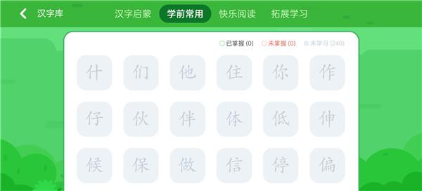 1、先选择对应的学习阶段,有汉字启蒙、学前常用、快来阅读三个阶段可供选择