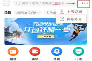 1、首先,登陆卖号玩APP,它是信用非常棒的租号平台,出租账号的首选。可以用QQ或者微信直接登陆,无需注册,我们点击软件左上角,然后选择点击弹出的”发布账号“功能选项。