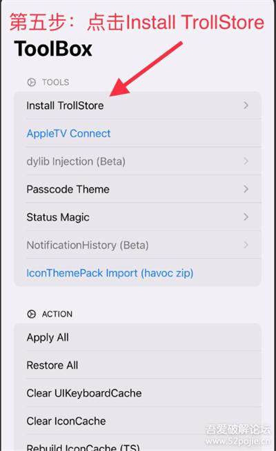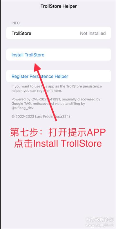 第七步:打开提示APP,点击Install TrollStore,耐心等待设备自动注销(其他不要乱动)