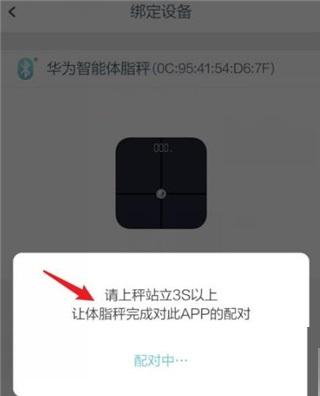 5、确定后,站立在体脂秤上,页面会显示配对中,等待配对成功即可。