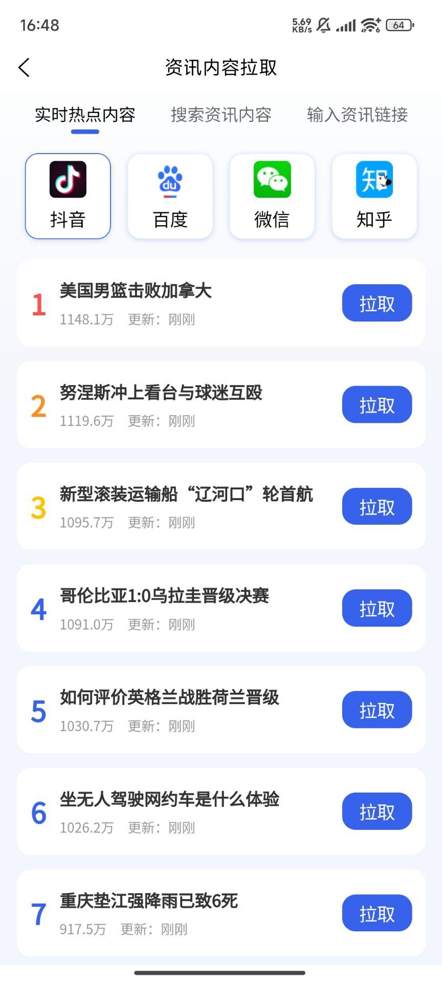 热点搜索:对接搜索引擎的热搜列表,实时获取热点话题,为创作提供灵感。