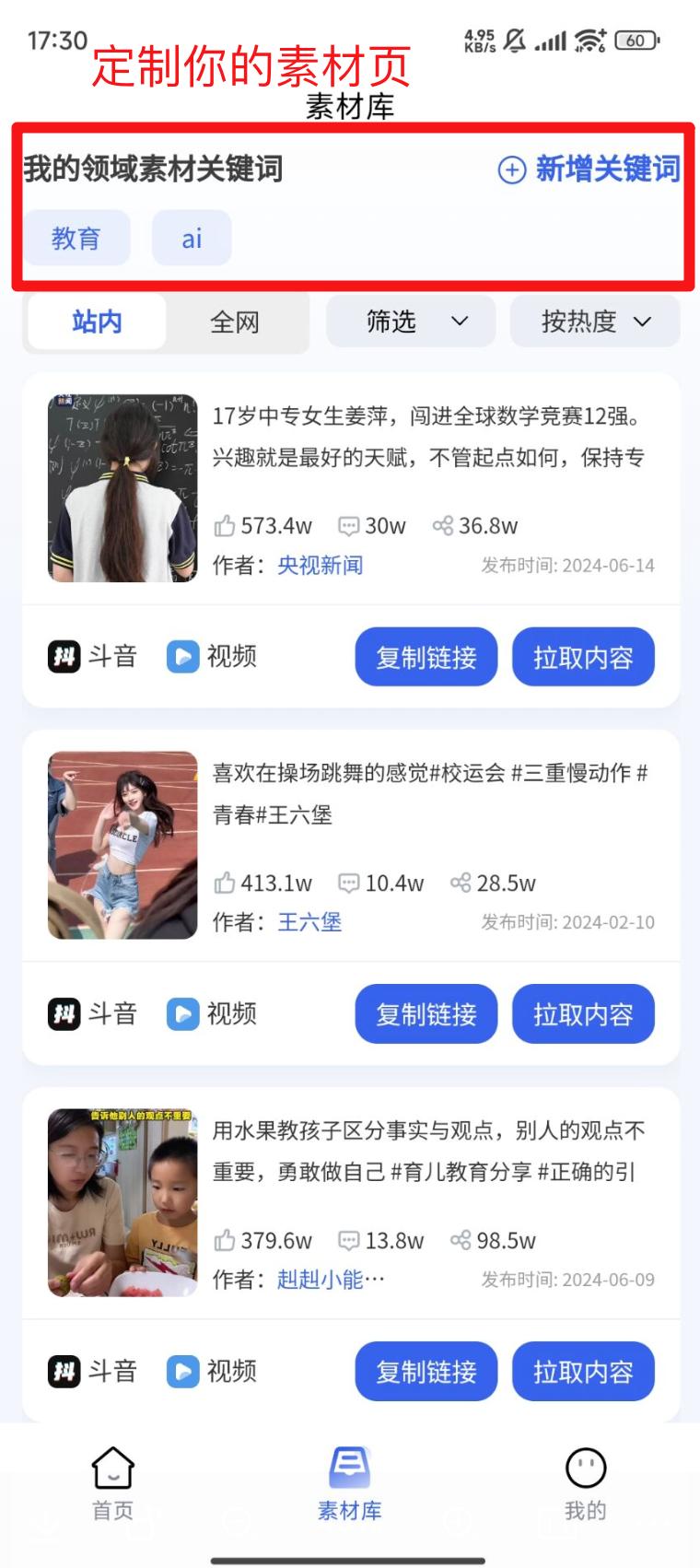 说明:设定自己领域的关键词,每天推荐最新的相关素材。也可以根据关键词去搜索全网素材和文案。