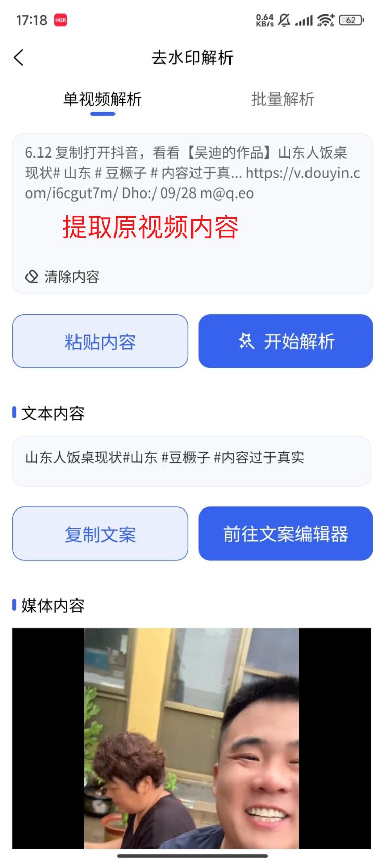 2:选中一个视频复制分享链接,在 媒工坊APP中进行去水印处理获取到原视频。