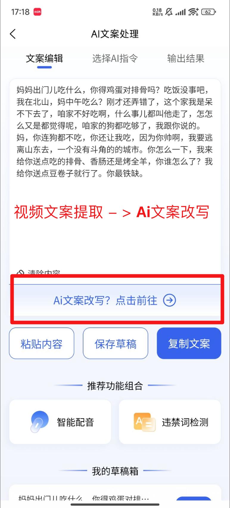 4: 对原视频进行文案提取+Ai文案内容优化,可以自己写Ai优化语句,也可以用预设好的,产品通顺且和抖音内容统一的文本内容,保存到草稿。