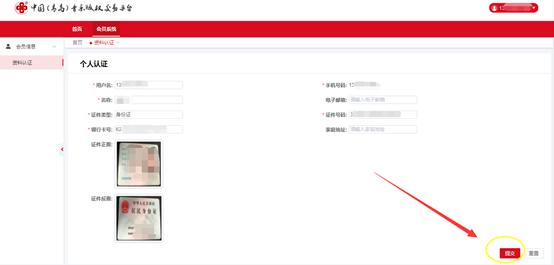 3.1个人用户默认用户名为注册时所填写的手机号码,默认证件类型为身份证,请准确填写本人信息,“名称”请填写本人姓名(需要与身份证信息一致且为注册手机号的持有人),并请填写本人证件号码,这页所填写的银行卡号预留手机号须与注册手机号保持一致(否则将会影响后面的签约及交易),并请上传真实的证件正、反面照片(正面上传人像面,反面上传国徽面)后,点击提交,认证完成。