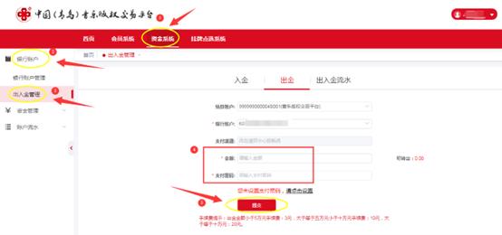 登录[中国(青岛)音乐版权交易平台]官网后,点击[资金系统]-[银行账户]-[出入金管理],点击[出金],输入需要转账出金的金额及支付密码(支付密码请在[会员信息]-[安全设置]-[支付密码]选项内进行修改),点击提交按钮即完成出金。