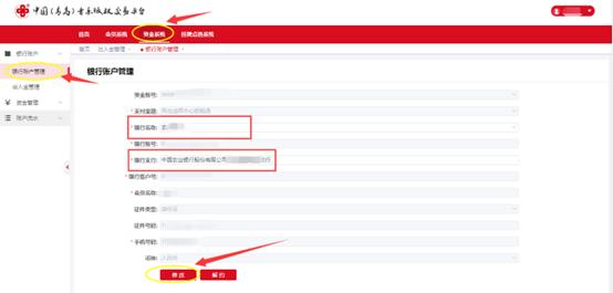 3.1登录后点击[资金系统]-[银行账户]-[银行账户管理],进入页面后,按照已经填写且绑定的银行卡账号,将对应的“银行名称”、“银行支行”信息选择为银行卡的正确信息,点击[修改]保存。