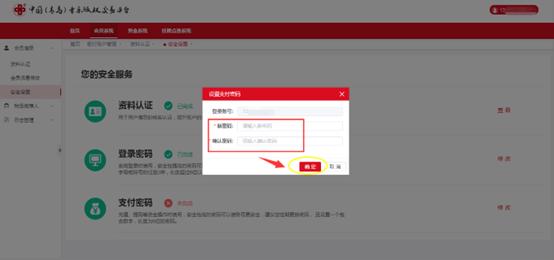 点击首行菜单栏[会员系统],点击左侧导航栏[会员信息],点击[安全设置],点击“支付密码”选项后面的[修改]按钮,进入修改页面,输入两遍相同的6位数字密码后点击[确定],即完成密码修改。
