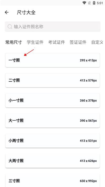输入关键字,智能搜索你想要的规格尺寸;一寸照、二寸照、学生证件照、考试证件照照、工作证件照……海量尺寸,规格齐全,是你拍证件照的首选