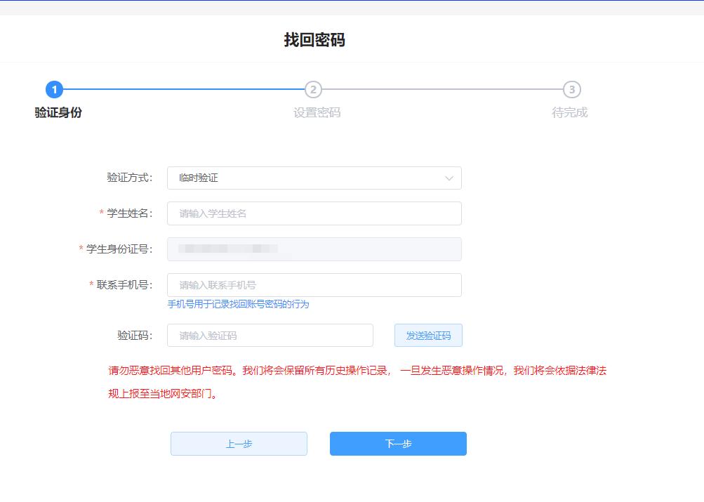 (2)临时验证,输入学生姓名,手机号、验证码找回 。
