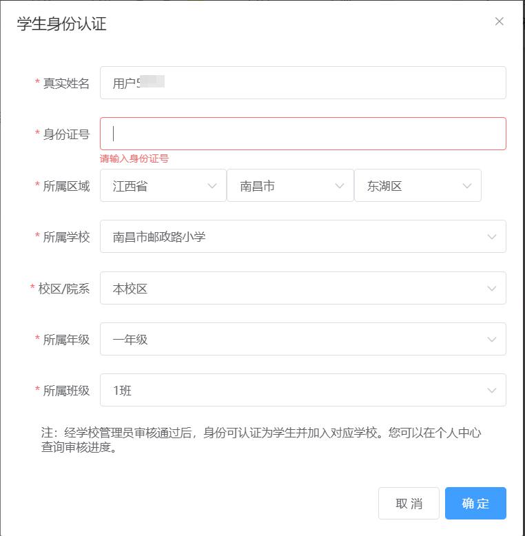 请输入正确的姓名、身份证号码、学校区域归属、学校名称、年级班级信息,点击“确定”;