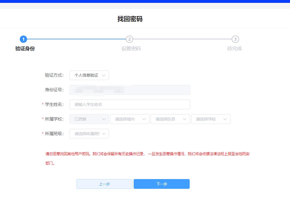 (1)个人信息验证,输入学生姓名、学校、班级信息找回