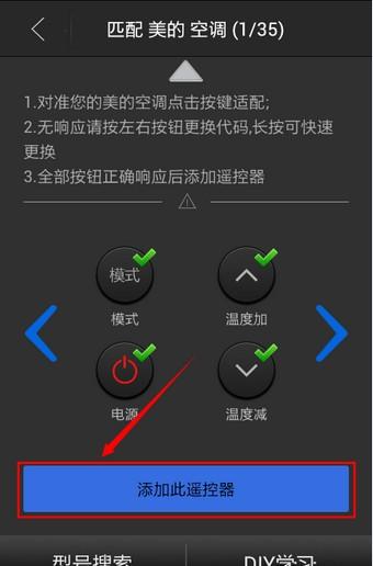 打开添加遥控器,依次点选家电型号、品牌,再对遥控按键逐个匹配,成功后即可添加此款家电的遥控器,下面以美的空调为例进行说明。
