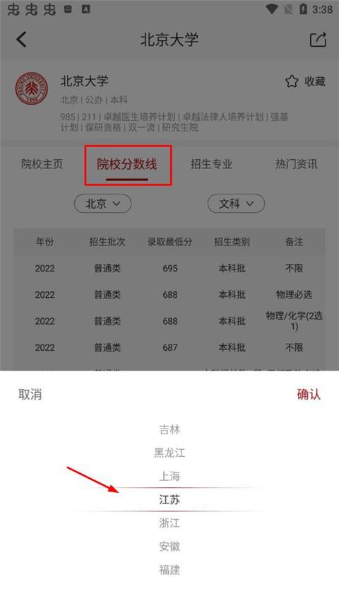 3、点击院校分数,还可查看该院校针对不同地区的历年招生分数线。如:江苏。