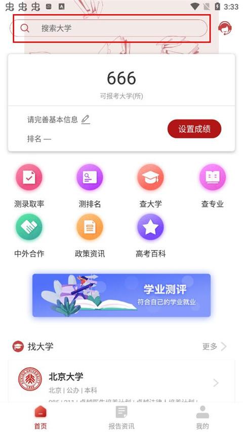 1、进入企鹅高考志愿app主页后,点击上方查询学校,如:北京大学