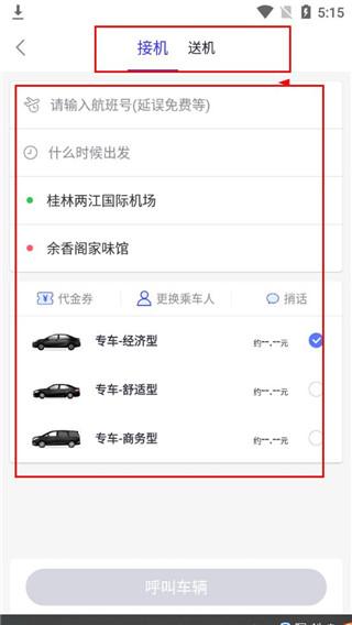 4、软件还提供了接机、送机等功能为您服务,支持选择不同的出行方式和车辆,进行呼叫