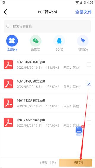 2、根据自己的需求选择需要用到的功能进入,如PDF转Word,选择需要转换的文件,点击“去转换”;
