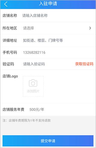 2、输入店铺名称、选择地区、地址、以及手机号、店铺logo后,点击提交申请,通过后即可开店啦。