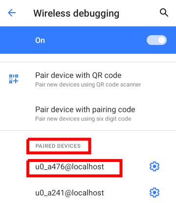 若要获取手动配对的详细信息,请转到“开发人员选项”-“>”无线调试“->”使用配对代码配对设备”。您需要在目标上执行此操作。