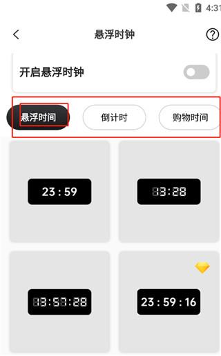 3、点击悬浮时钟,你可以设置悬浮时间、倒计时,或者是购物时间,开启悬浮时钟按钮即可。