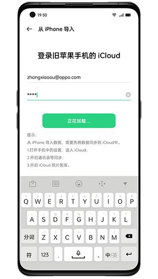 1、打开OPPO手机搬家应用,并选择”从iPhone导入”。输入苹果手机的iCloud账号和密码。