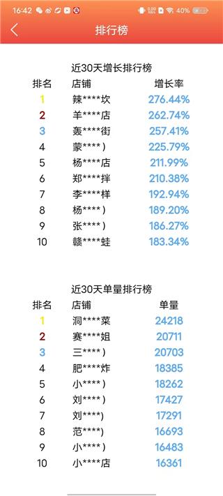 3、点击【排行榜】,可以查看近30天的增长排行以及单量排行;