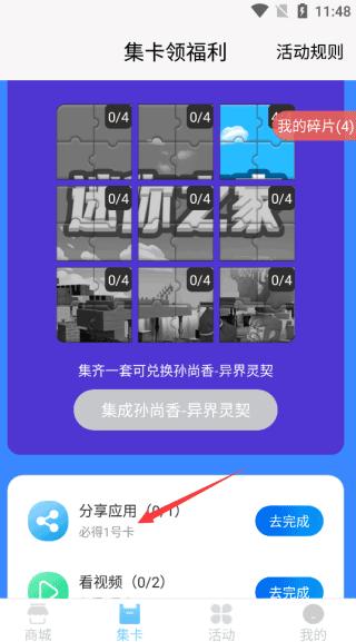 2、在集卡功能栏,我们能找到你想要兑换的皮肤,通过做任务集卡的形式就能兑奖。
