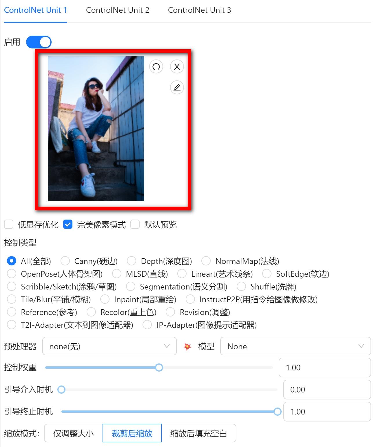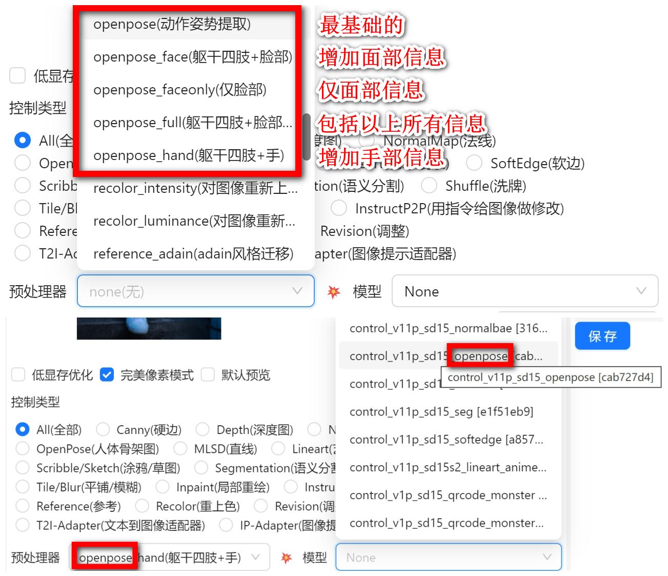 这里可以看到openpose的预处理器有5个,根据需要的进行筛选。
