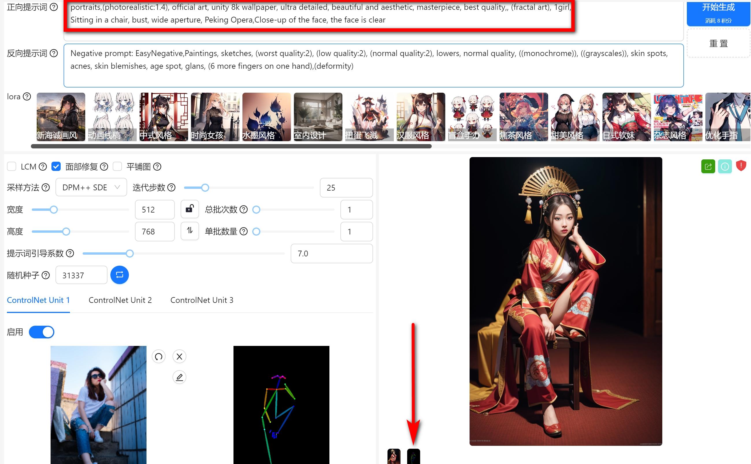 生成后你会发现,人物的姿势跟你提供的照片姿势完全一致,并且生成下方有两个图片,第二张就是预处理器处理过后图片所得的图像。